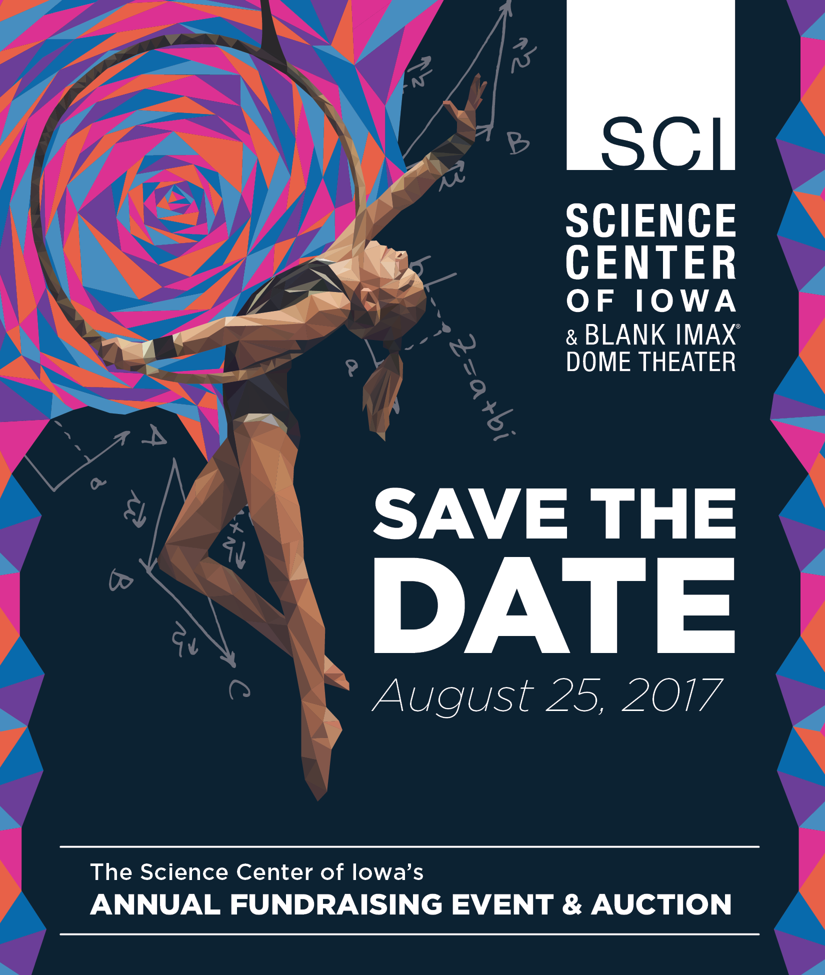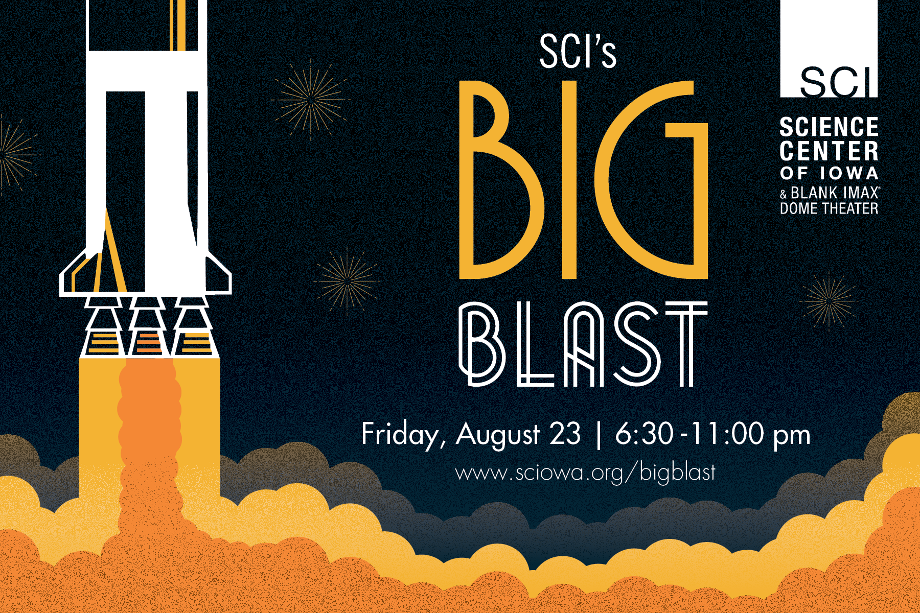 Each year, at the Science Center of Iowa, I was responsible for creating the branding, marketing collateral, and event signage for our annual fundraising event. I was provided with a theme for the year by our annual event committee and then developed that year's branding based on the theme. This year's theme was the start of our Big Blast theme, which was the kick-off event of a three-year lead-up to SCI's 50th anniversary. We went with an Art Deco design with scientific elements.
