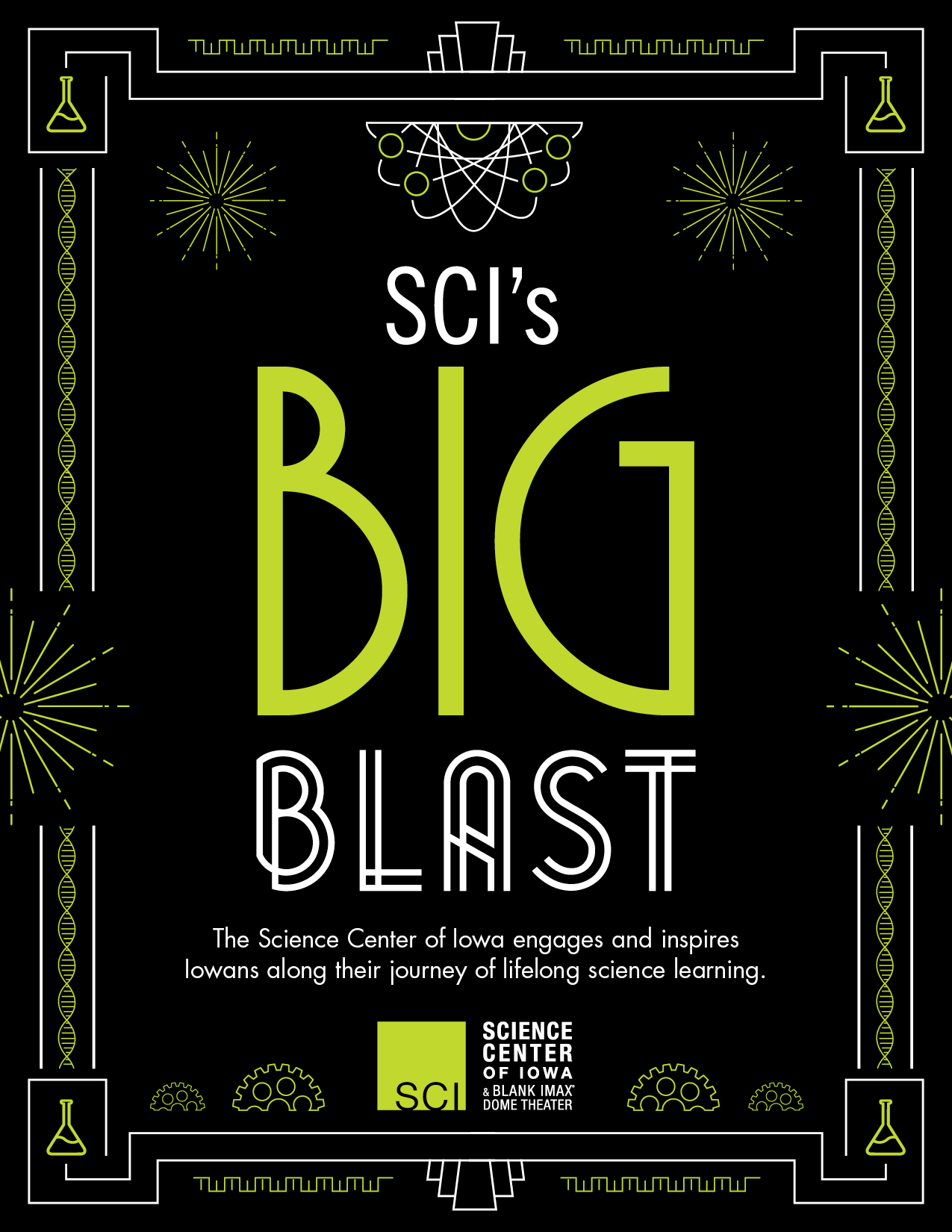 Each year, at the Science Center of Iowa, I was responsible for creating the branding, marketing collateral, and event signage for our annual fundraising event. I was provided with a theme for the year by our annual event committee and then developed that year's branding based on the theme. This year's theme was a continuation of the Big Blast theme, but with a different look, all leading up to SCI's 50th anniversary.